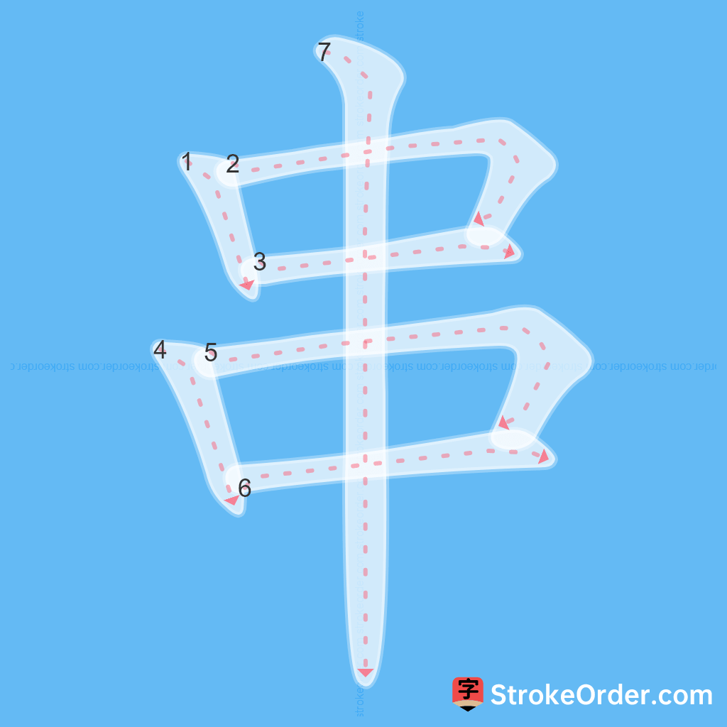 Watch the video of writing the Chinese character "串", learn the correct stroke order (笔顺) of the character "串", and master the standard way of writing the character "串".