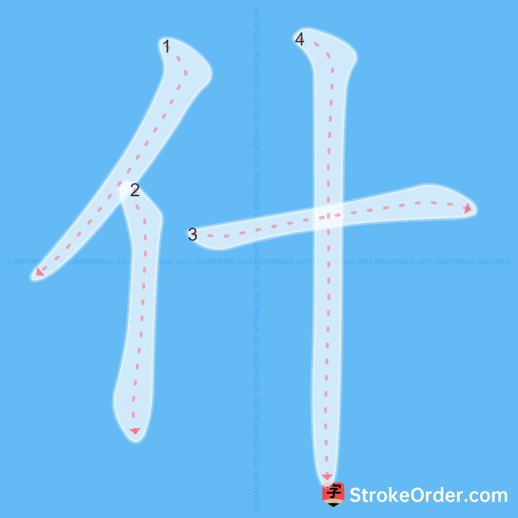 Watch the video of writing the Chinese character "什", learn the correct stroke order (笔顺) of the character "什", and master the standard way of writing the character "什".