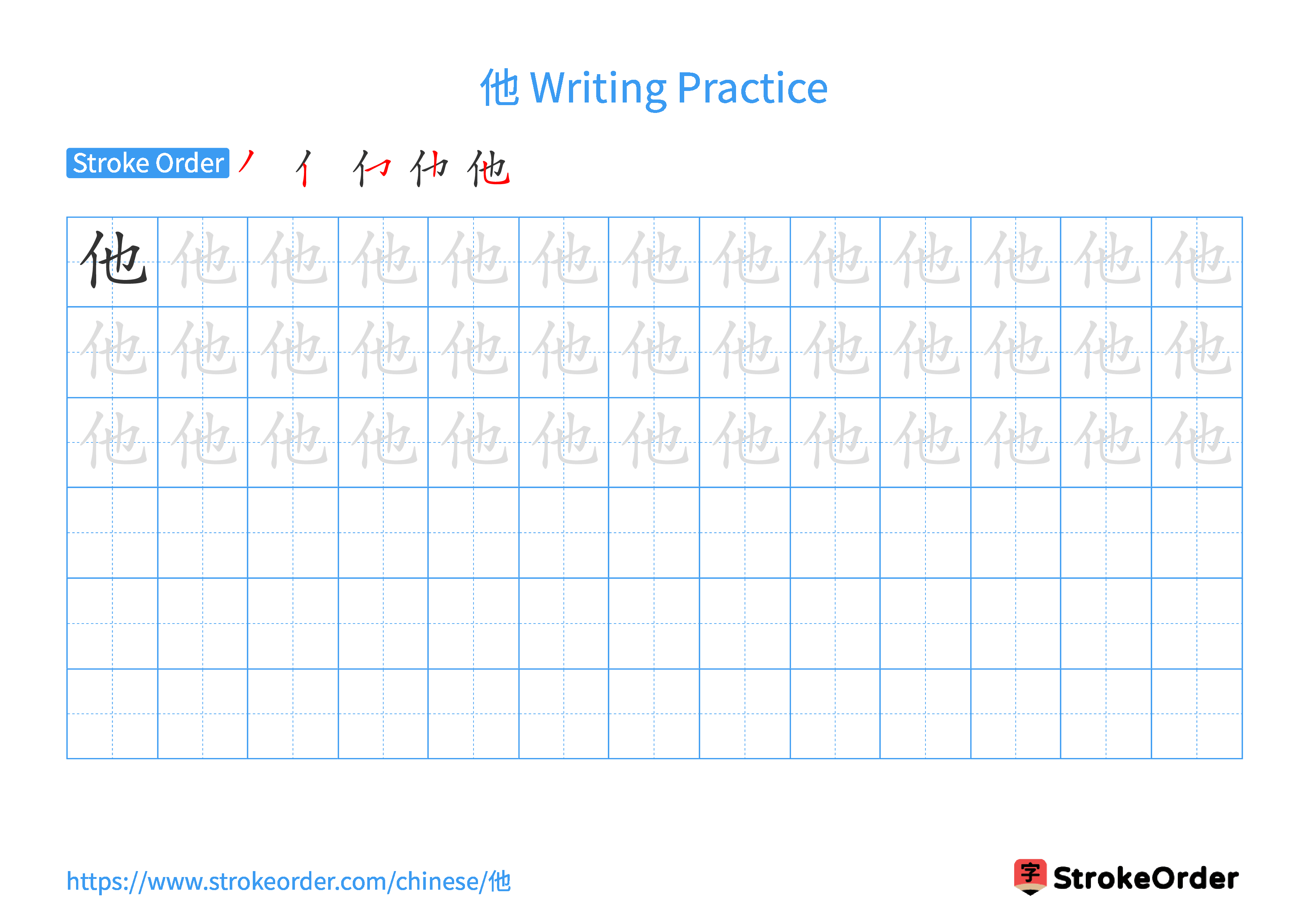 Printable Writing Practice Worksheet of "他" in Portrait Orientation (Tian Zi Ge)