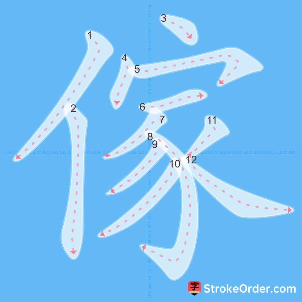 Watch the video of writing the Chinese character "傢", learn the correct stroke order (笔顺) of the character "傢", and master the standard way of writing the character "傢".