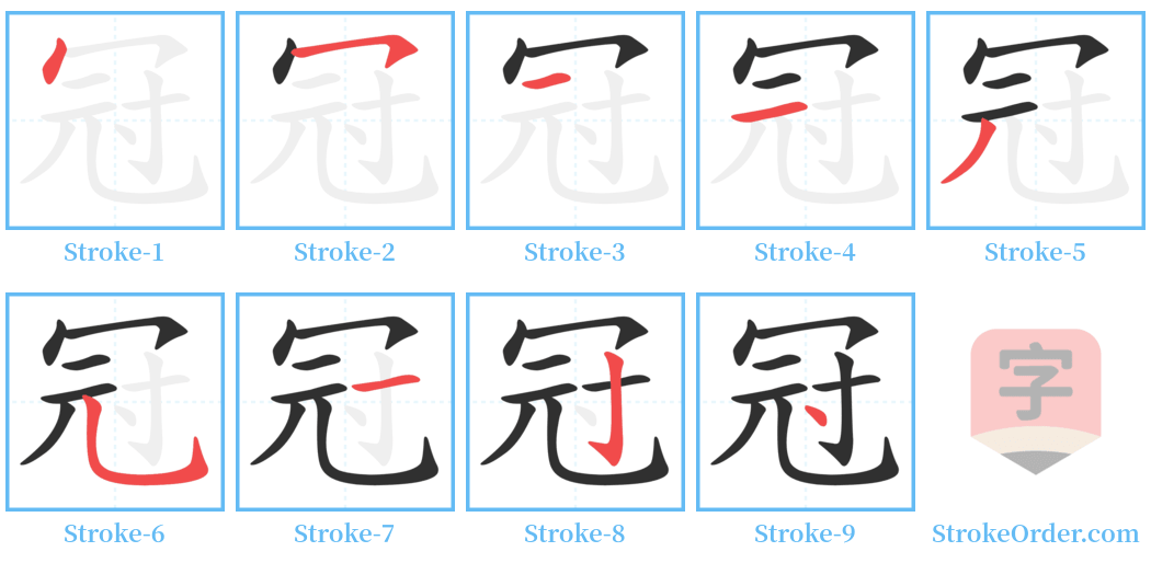 Watch the video of writing the Chinese character "冠", learn the correct stroke order (笔顺) of the character "冠", and master the standard way of writing the character "冠".