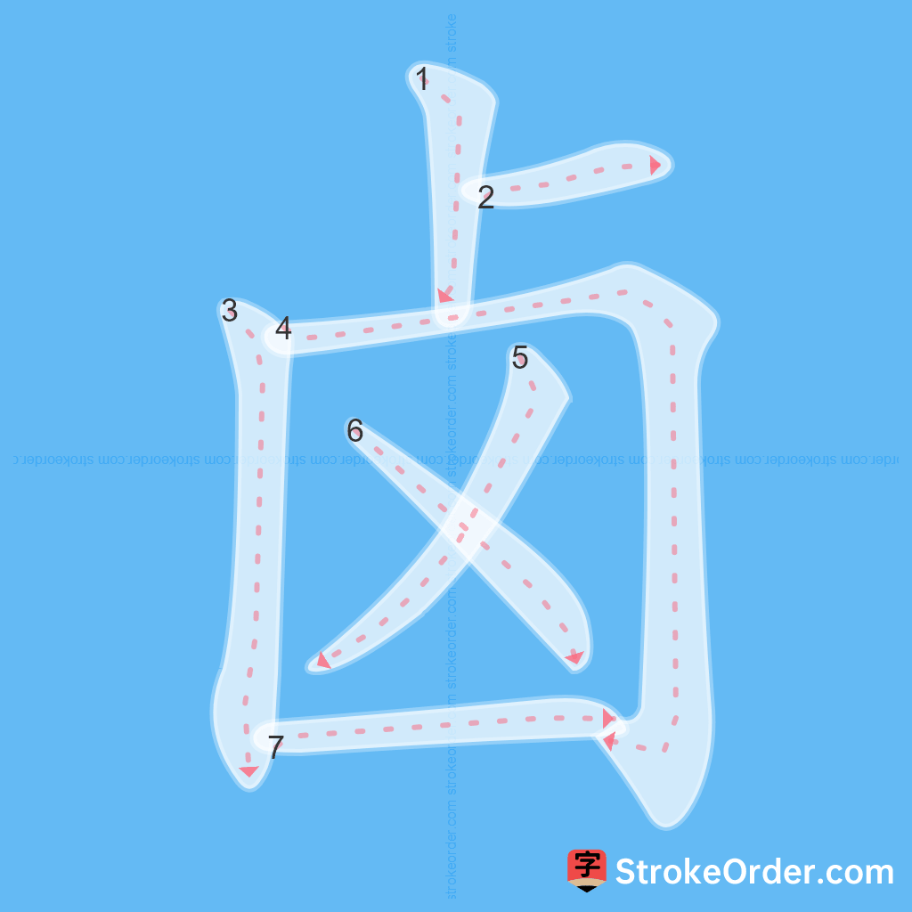 Watch the video of writing the Chinese character "卤", learn the correct stroke order (笔顺) of the character "卤", and master the standard way of writing the character "卤".