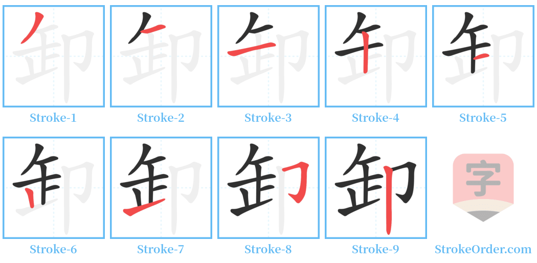 Watch the video of writing the Chinese character "卸", learn the correct stroke order (笔顺) of the character "卸", and master the standard way of writing the character "卸".