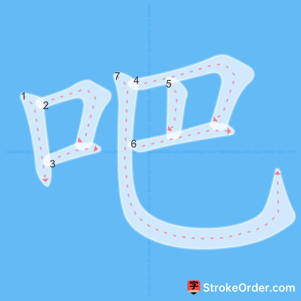 Watch the video of writing the Chinese character "吧", learn the correct stroke order (笔顺) of the character "吧", and master the standard way of writing the character "吧".