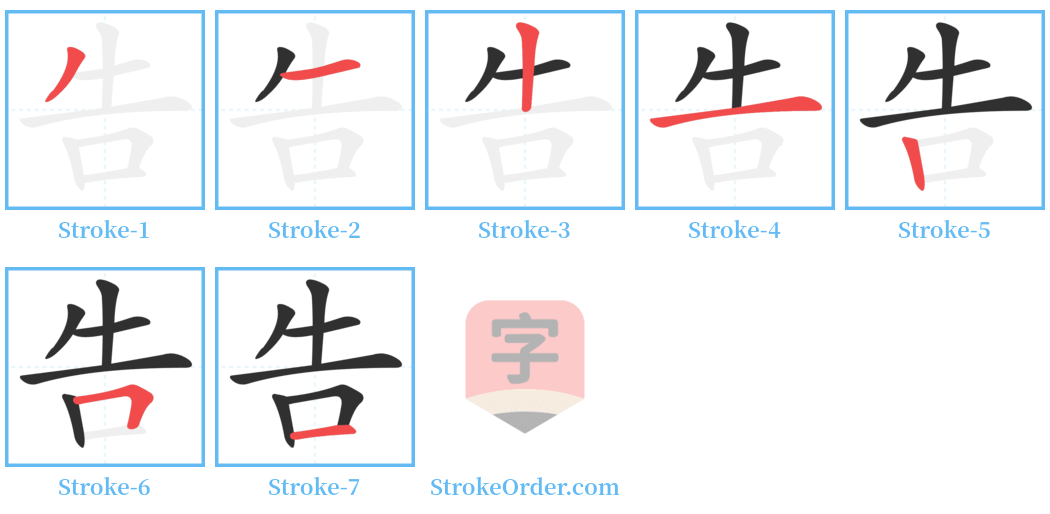 Watch the video of writing the Chinese character "告", learn the correct stroke order (笔顺) of the character "告", and master the standard way of writing the character "告".