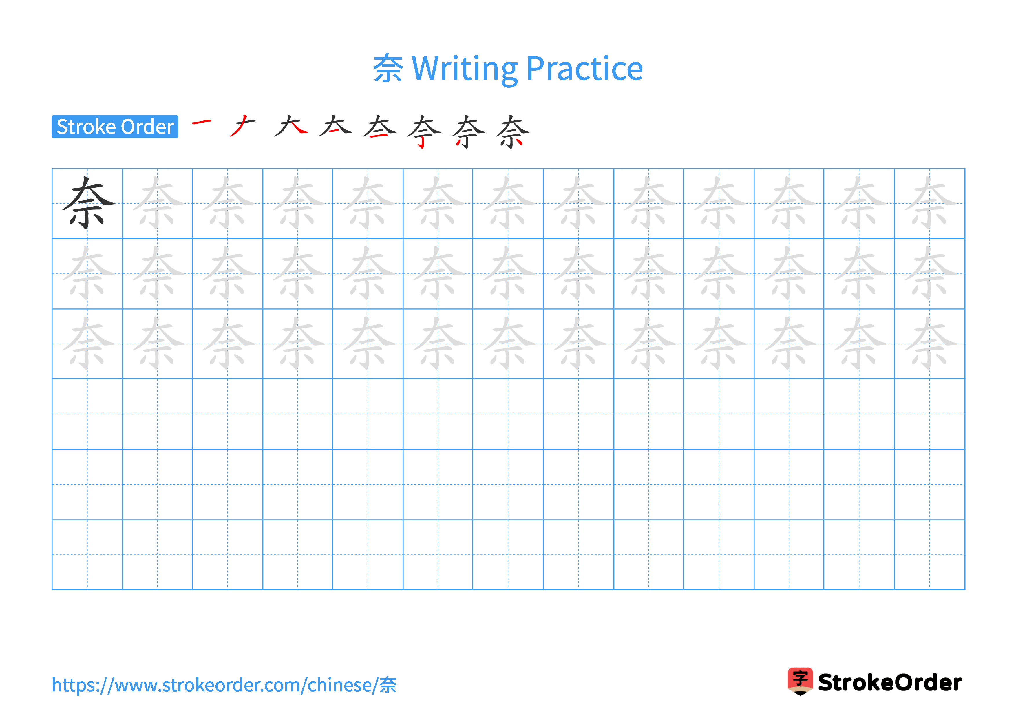Free Printable Handwriting Practice with Stroke Order: 奈