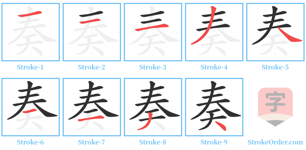 Watch the video of writing the Chinese character "奏", learn the correct stroke order (笔顺) of the character "奏", and master the standard way of writing the character "奏".