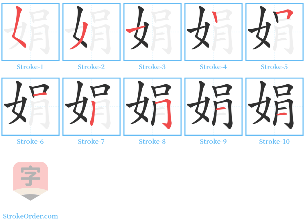 Watch the video of writing the Chinese character "娟", learn the correct stroke order (笔顺) of the character "娟", and master the standard way of writing the character "娟".