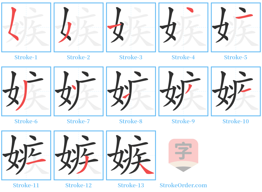Watch the video of writing the Chinese character "嫉", learn the correct stroke order (笔顺) of the character "嫉", and master the standard way of writing the character "嫉".