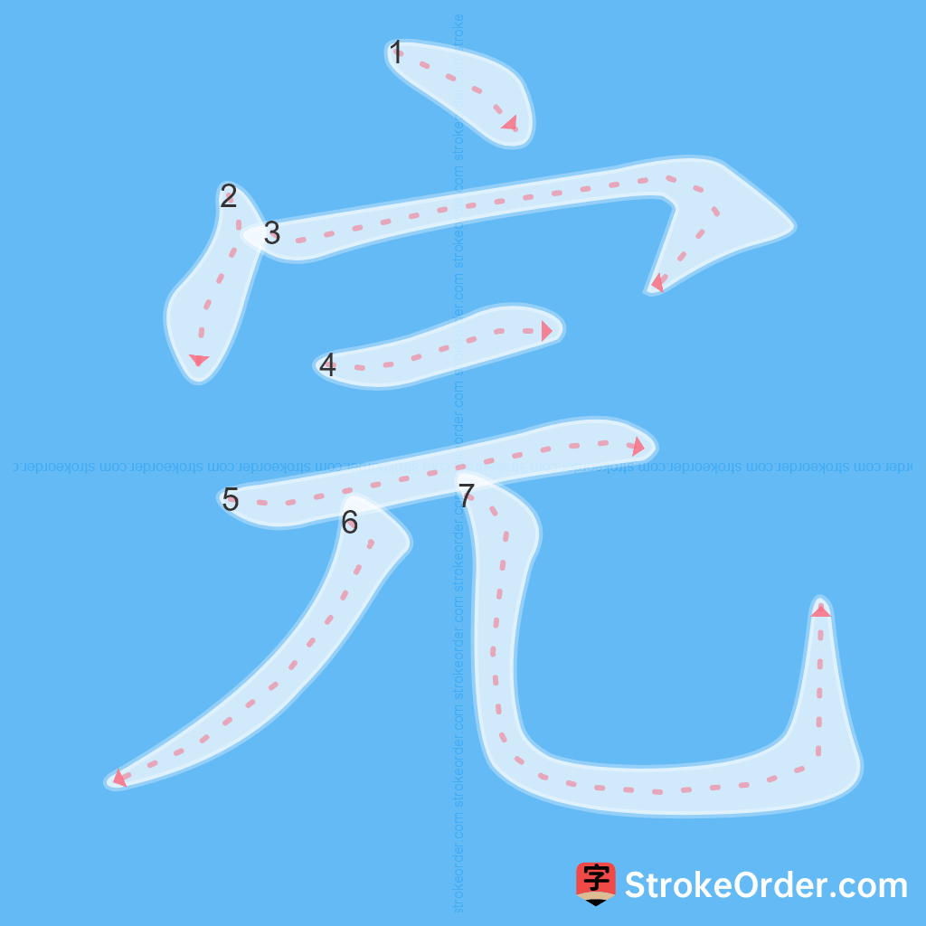 Watch the video of writing the Chinese character "完", learn the correct stroke order (笔顺) of the character "完", and master the standard way of writing the character "完".