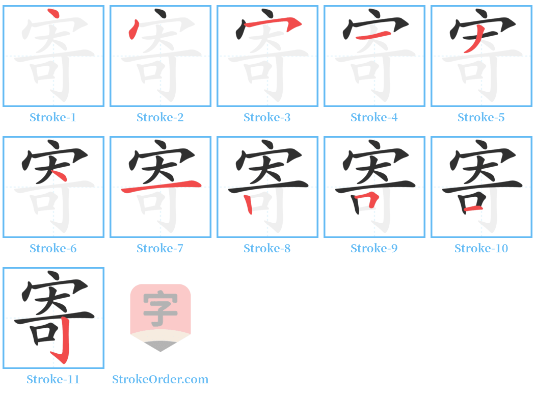 Watch the video of writing the Chinese character "寄", learn the correct stroke order (笔顺) of the character "寄", and master the standard way of writing the character "寄".