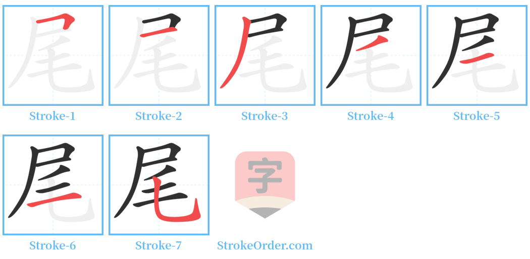 Watch the video of writing the Chinese character "尾", learn the correct stroke order (笔顺) of the character "尾", and master the standard way of writing the character "尾".
