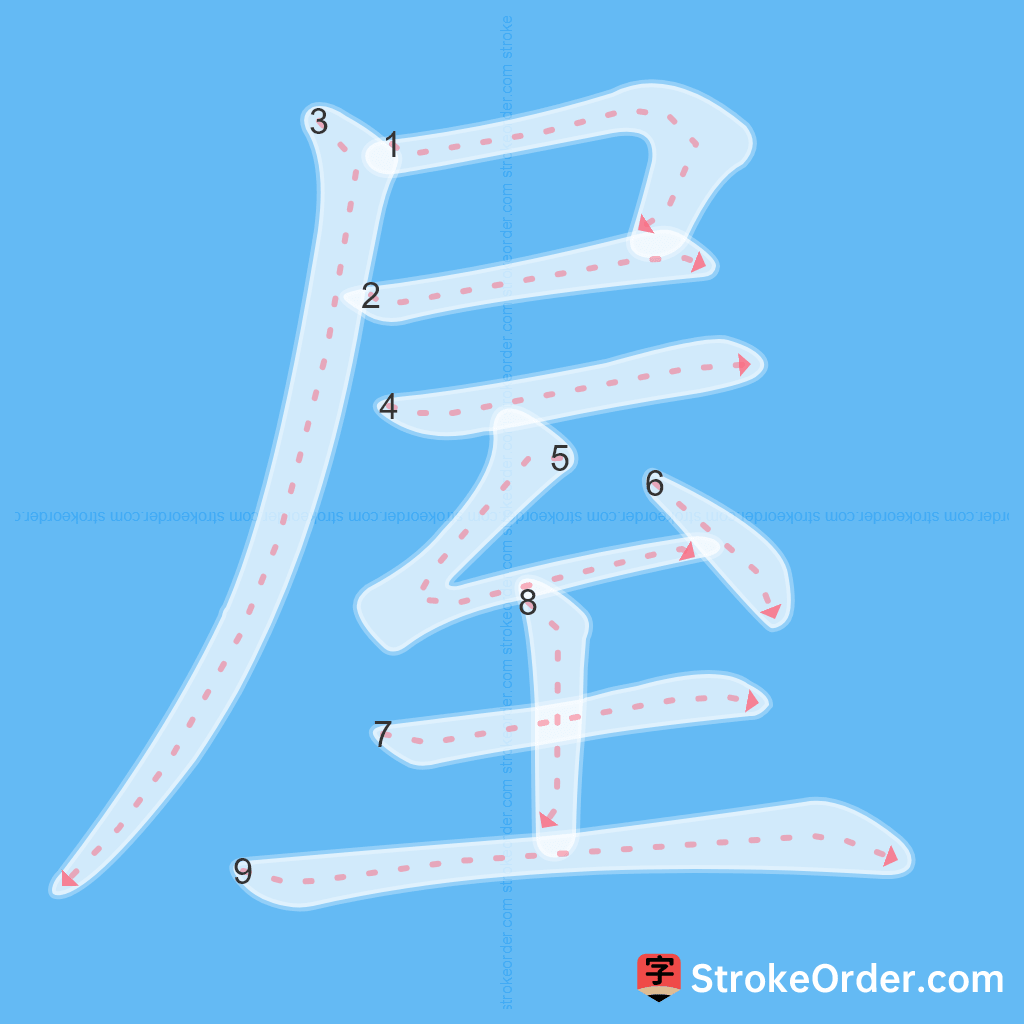 Watch the video of writing the Chinese character "屋", learn the correct stroke order (笔顺) of the character "屋", and master the standard way of writing the character "屋".