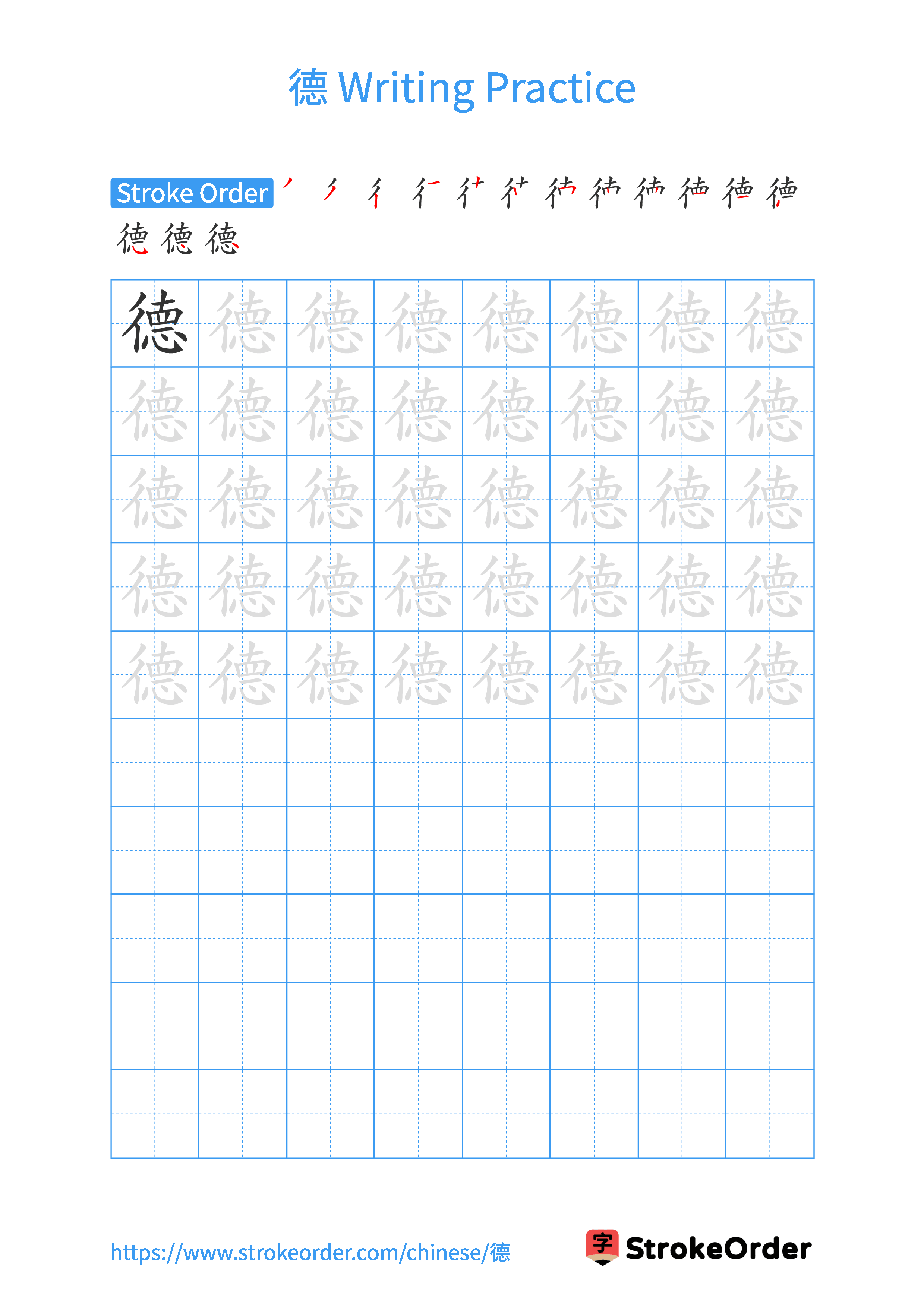 Free Printable Handwriting Practice with Stroke Order: 德