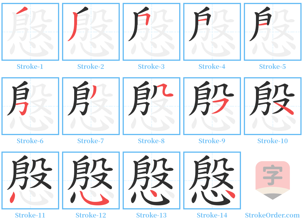 慇 [yīn] 〈形〉 1. 忧伤的样子 (sad) - 引: 《诗·小雅·正月》:念我独兮,忧心慇慇。 - 例: 又如:慇慇(忧伤的样子);慇忧(忧伤) 2. 恳切 (honest) - 引: 《史记·邹阳传》:慈仁慇勤。 - 引: 司马迁《报任少卿书》:接慇慇之余欢。 - 引: 清· 周亮工《书影》:虽慇然相勉,亦微讽其暮年之出也。 - 例: 又如:慇慇(情意恳切的样子);慇勤(情意恳切) 3. 通“殷”。殷实;富裕 (rich) - 引: 《古文苑》:钟天地之美,收九泽之利,以慇润国家。
