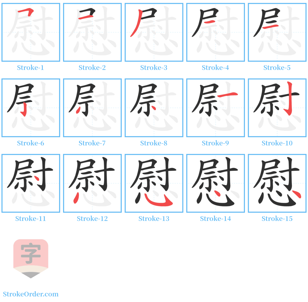 Watch the video of writing the Chinese character "慰", learn the correct stroke order (笔顺) of the character "慰", and master the standard way of writing the character "慰".