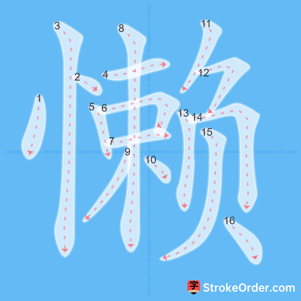 Watch the video of writing the Chinese character "懒", learn the correct stroke order (笔顺) of the character "懒", and master the standard way of writing the character "懒".