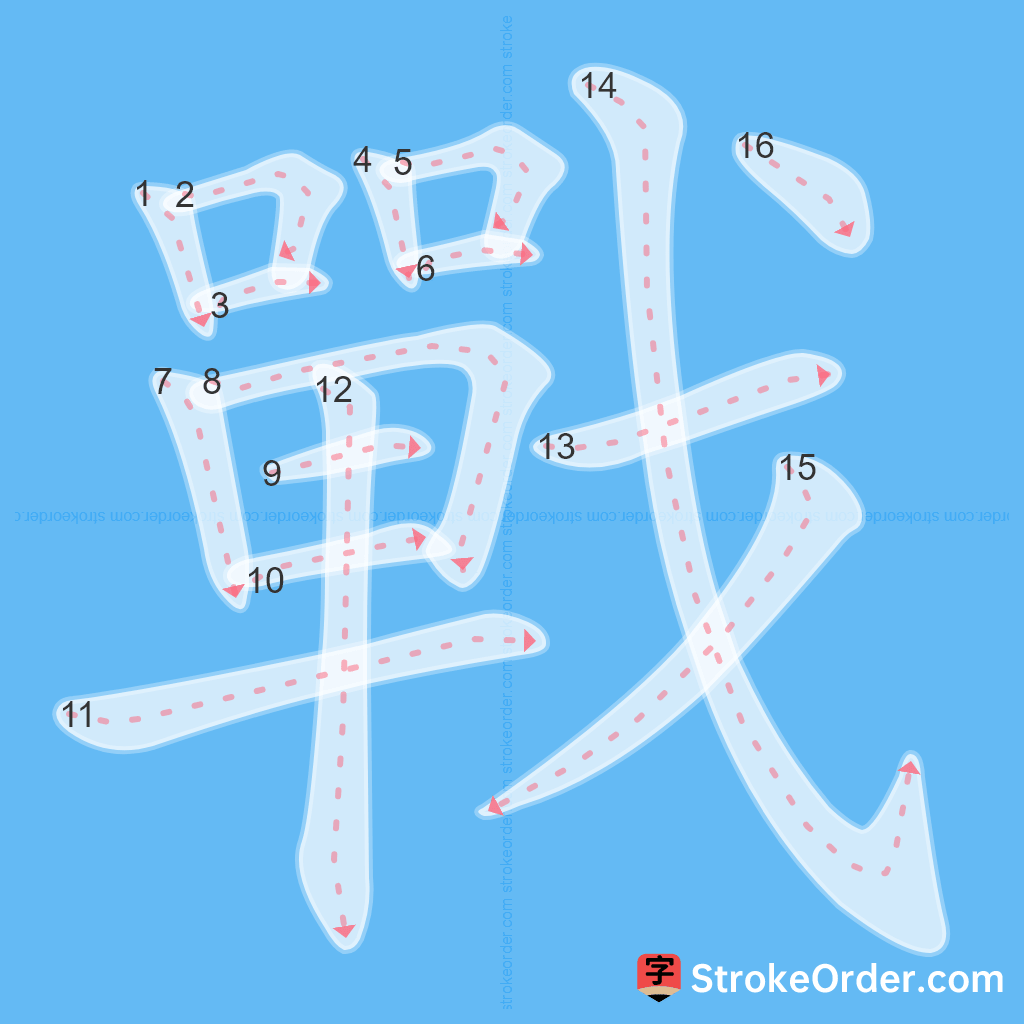 Watch the video of writing the Chinese character "戰", learn the correct stroke order (笔顺) of the character "戰", and master the standard way of writing the character "戰".