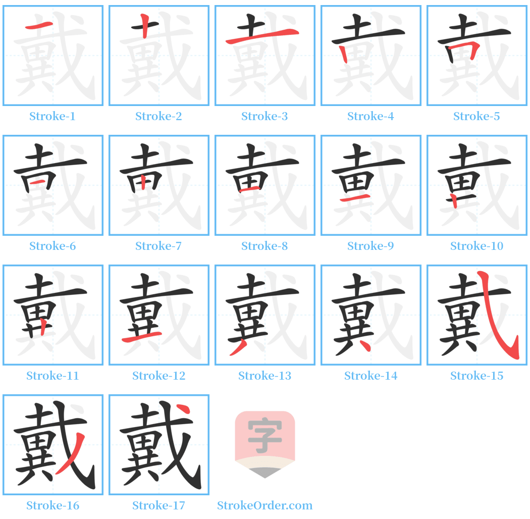 Watch the video of writing the Chinese character "戴", learn the correct stroke order (笔顺) of the character "戴", and master the standard way of writing the character "戴".