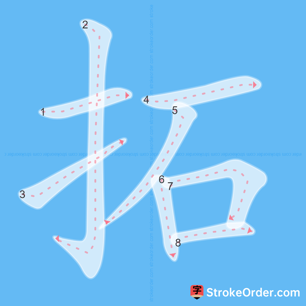 Watch the video of writing the Chinese character "拓", learn the correct stroke order (笔顺) of the character "拓", and master the standard way of writing the character "拓".