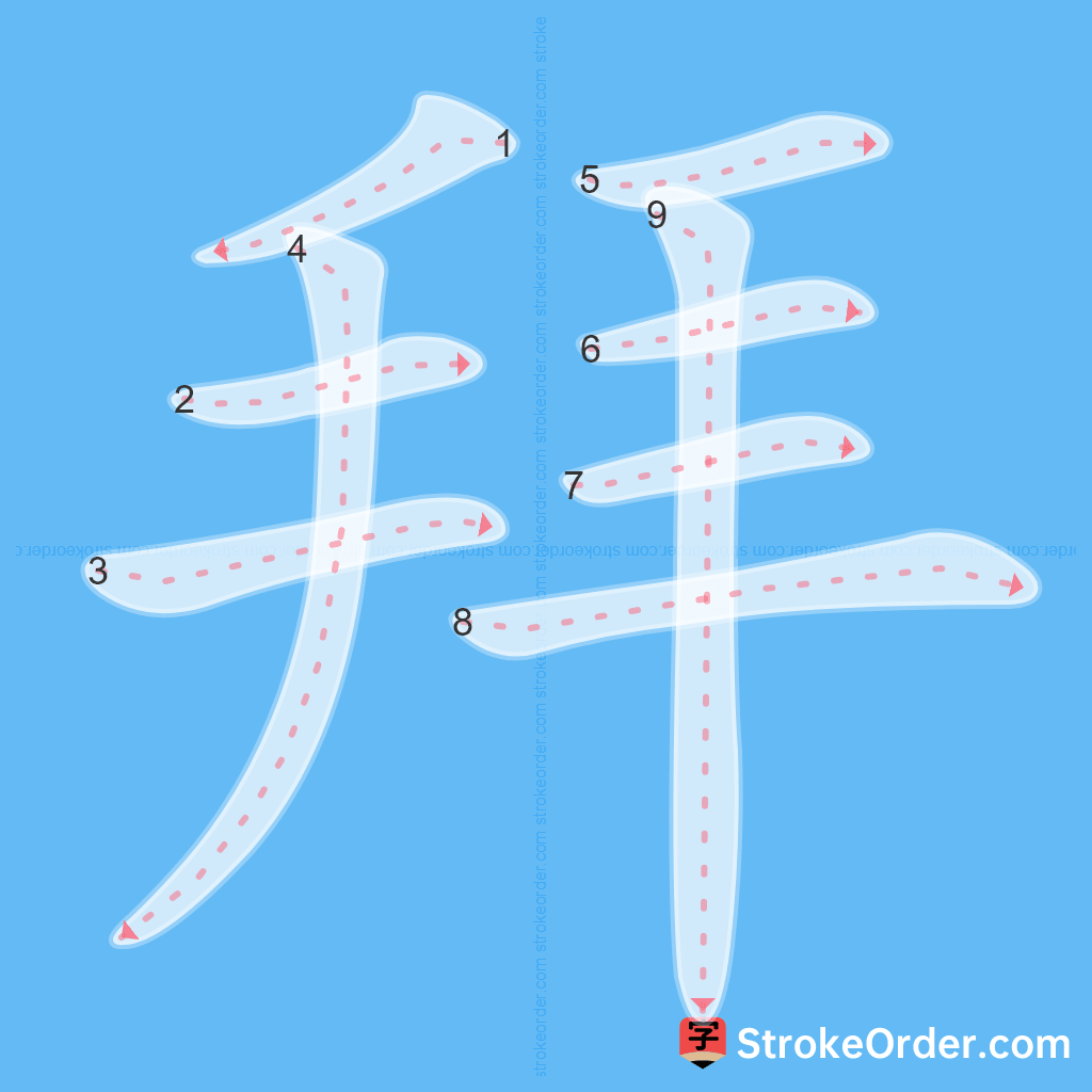 Watch the video of writing the Chinese character "拜", learn the correct stroke order (笔顺) of the character "拜", and master the standard way of writing the character "拜".