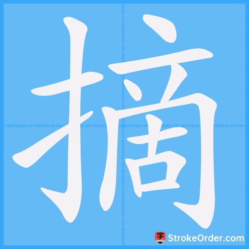 Watch the video of writing the Chinese character "摘", learn the correct stroke order (笔顺) of the character "摘", and master the standard way of writing the character "摘".