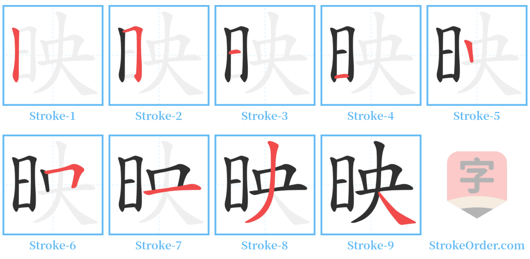 Watch the video of writing the Chinese character "映", learn the correct stroke order (笔顺) of the character "映", and master the standard way of writing the character "映".