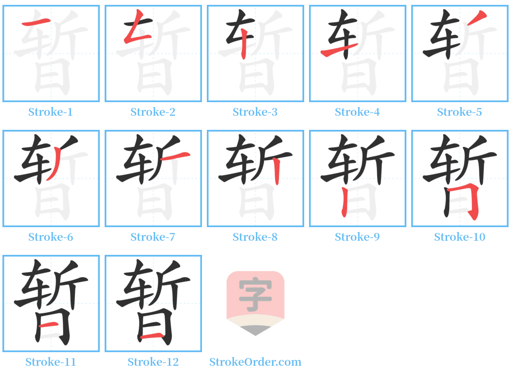 - Examples: 暂时 (temporary), 暂且 (for the moment), 暂缓 (pause briefly), 暂停 (temporarily stop), 暂行办法 (temporary measures).