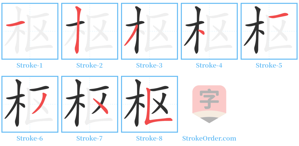 Watch the video of writing the Chinese character "枢", learn the correct stroke order (笔顺) of the character "枢", and master the standard way of writing the character "枢".
