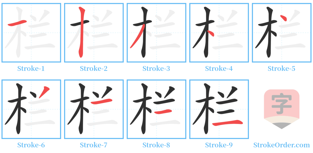 Watch the video of writing the Chinese character "栏", learn the correct stroke order (笔顺) of the character "栏", and master the standard way of writing the character "栏".