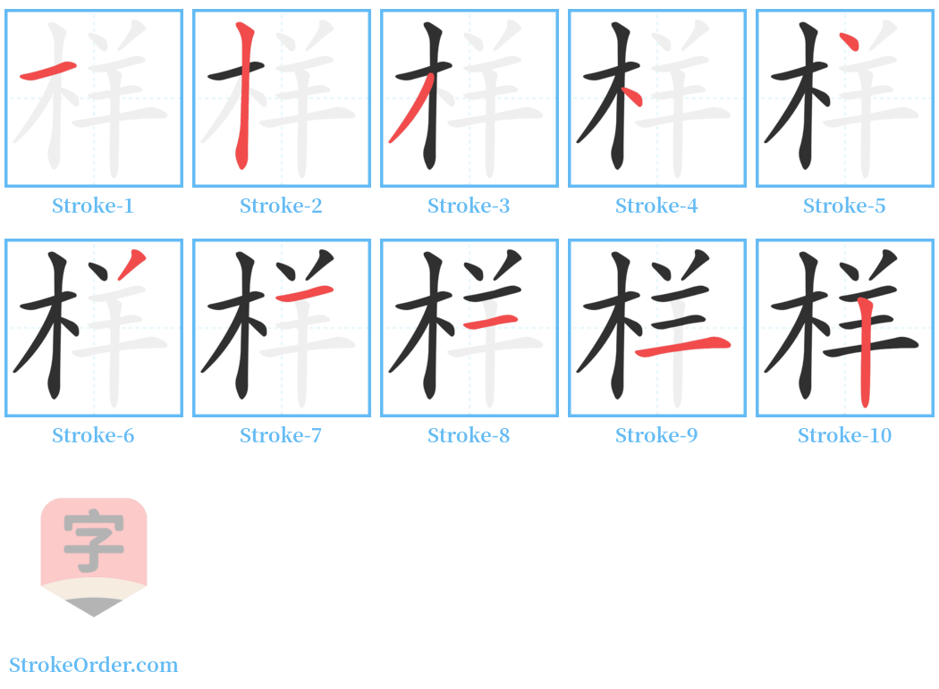 Watch the video of writing the Chinese character "样", learn the correct stroke order (笔顺) of the character "样", and master the standard way of writing the character "样".