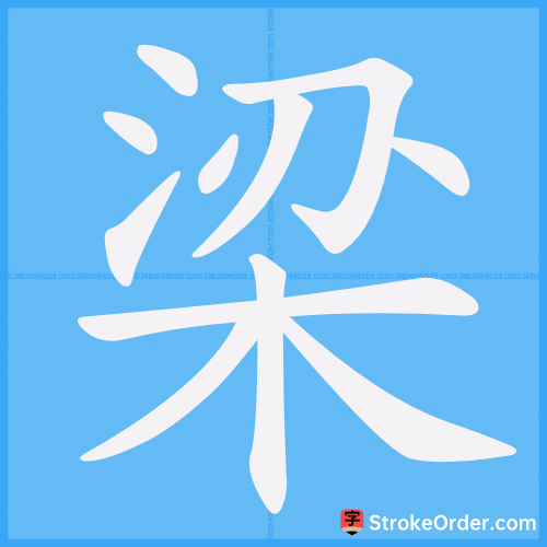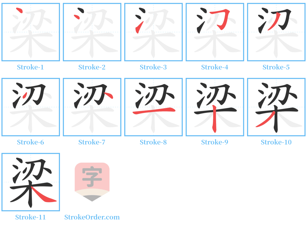 Watch the video of writing the Chinese character "梁", learn the correct stroke order (笔顺) of the character "梁", and master the standard way of writing the character "梁".