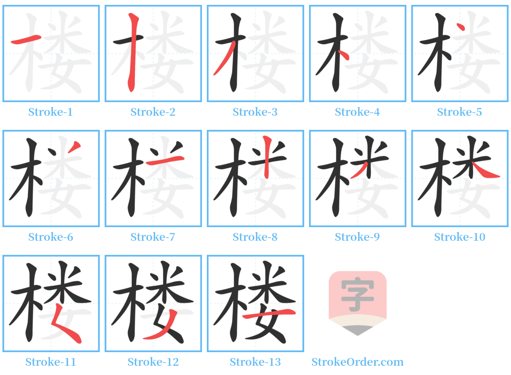 Watch the video of writing the Chinese character "楼", learn the correct stroke order (笔顺) of the character "楼", and master the standard way of writing the character "楼".