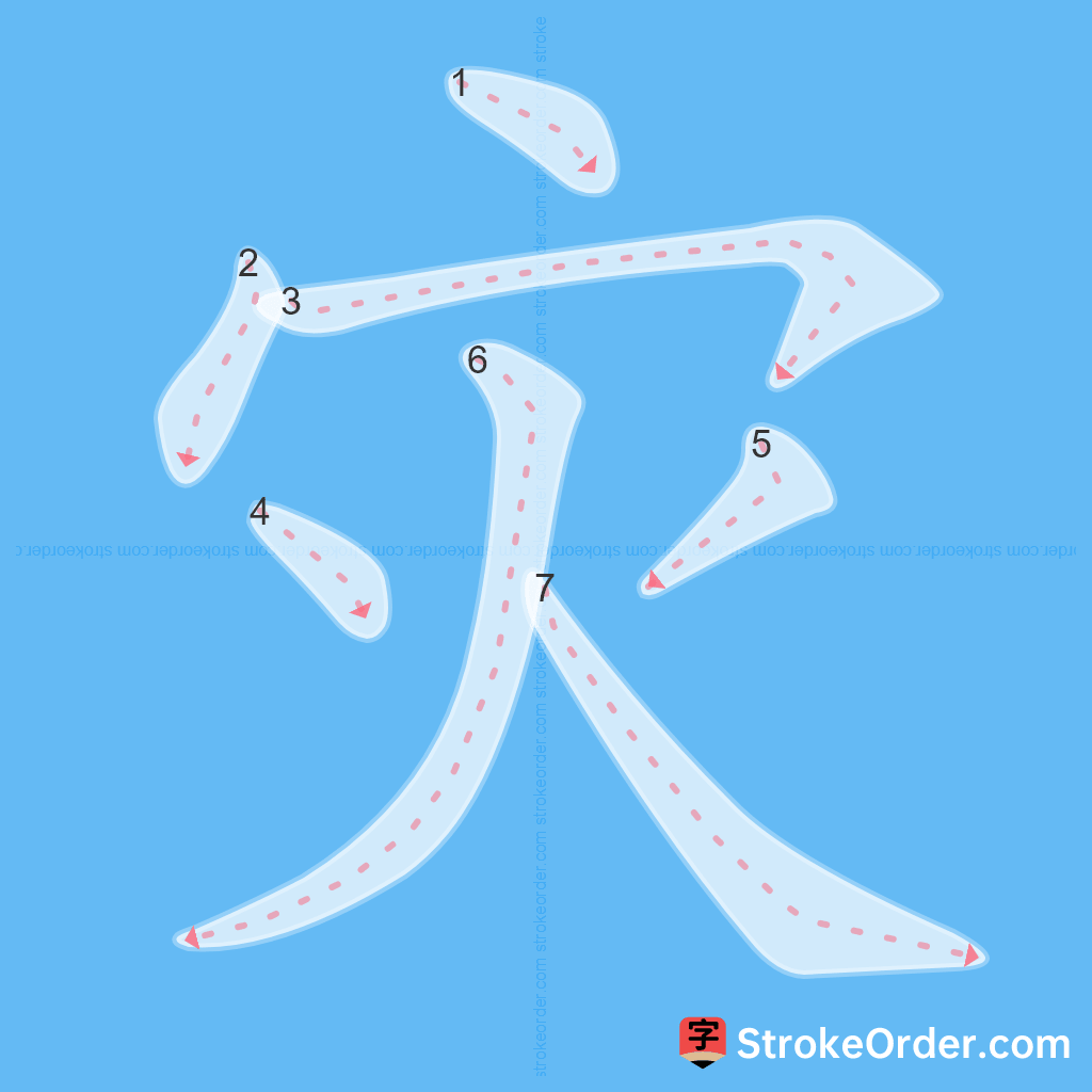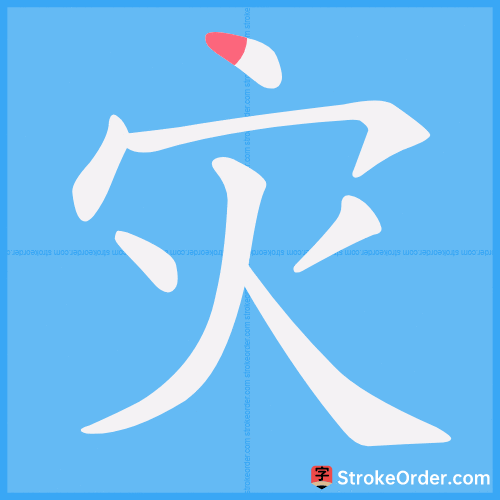 Watch the video of writing the Chinese character "灾", learn the correct stroke order (笔顺) of the character "灾", and master the standard way of writing the character "灾".