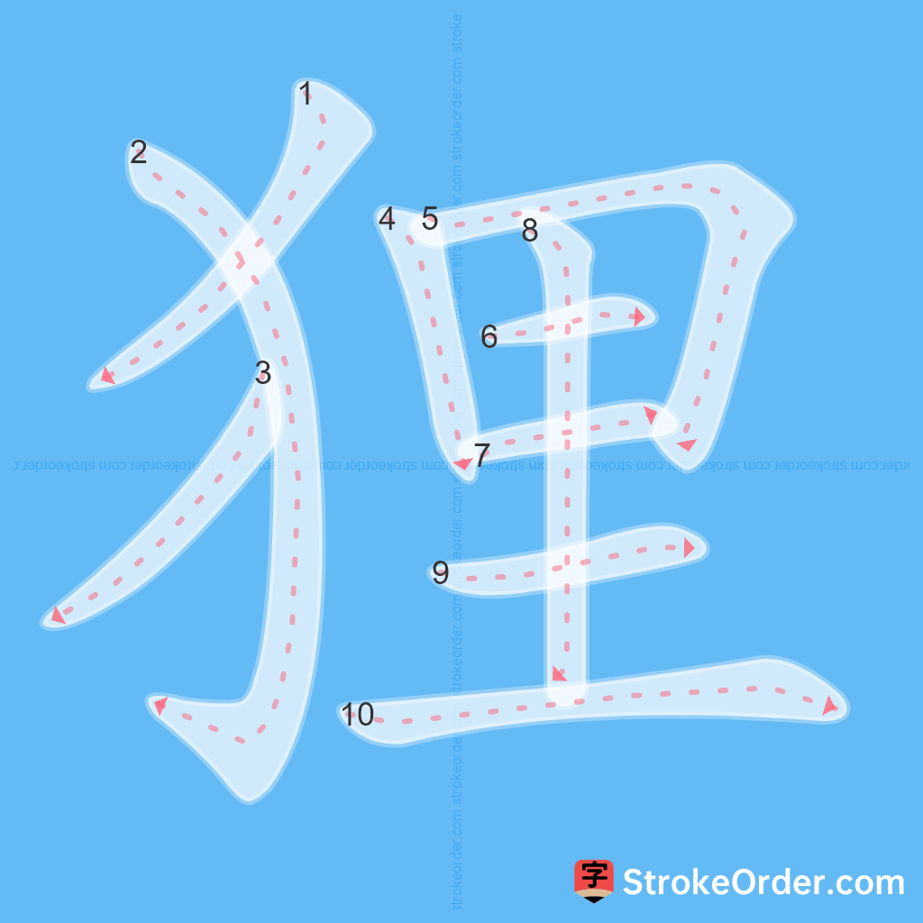 Watch the video of writing the Chinese character "狸", learn the correct stroke order (笔顺) of the character "狸", and master the standard way of writing the character "狸".