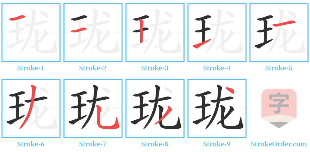 Watch the video of writing the Chinese character "珑", learn the correct stroke order (笔顺) of the character "珑", and master the standard way of writing the character "珑".