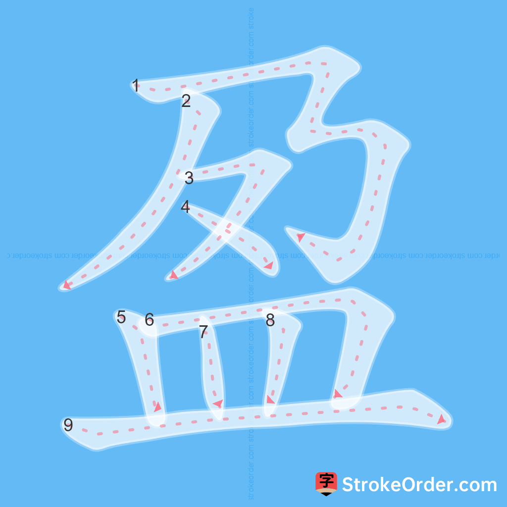 Watch the video of writing the Chinese character "盈", learn the correct stroke order (笔顺) of the character "盈", and master the standard way of writing the character "盈".