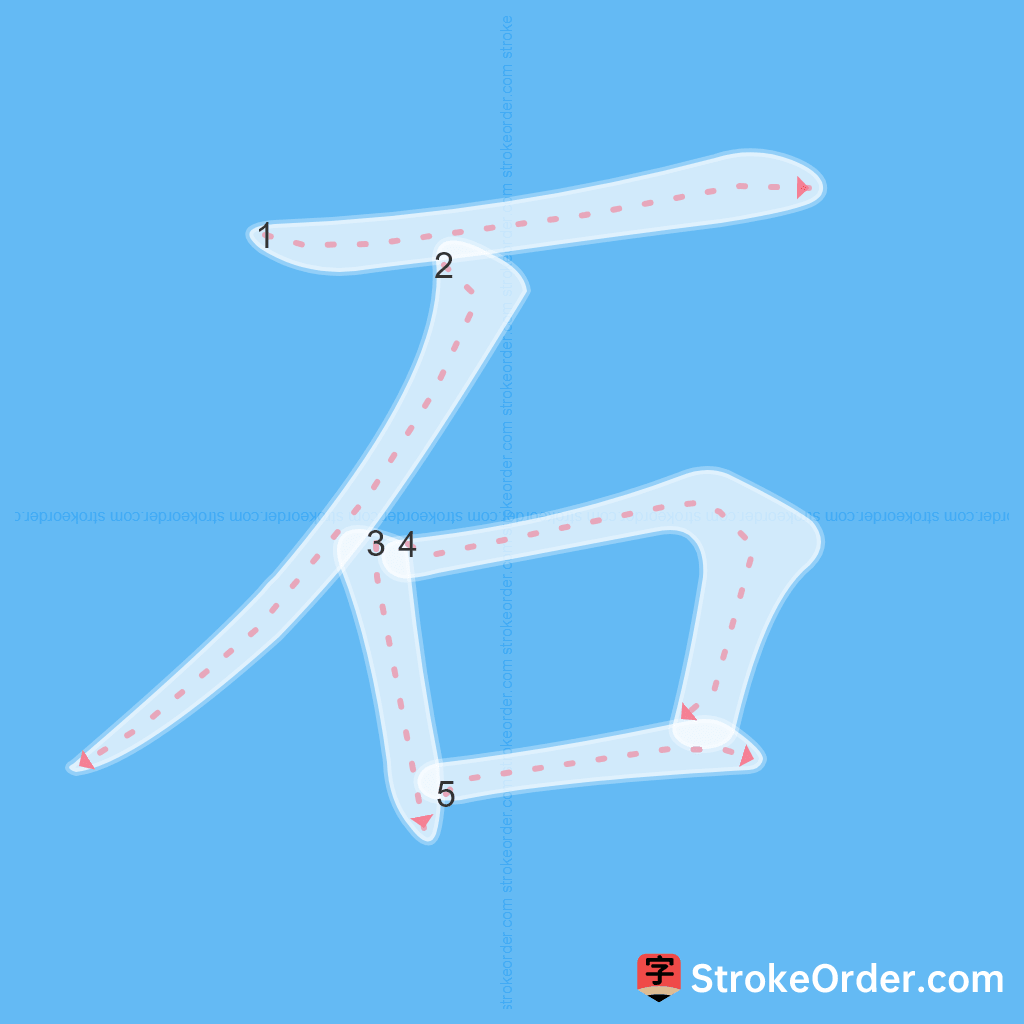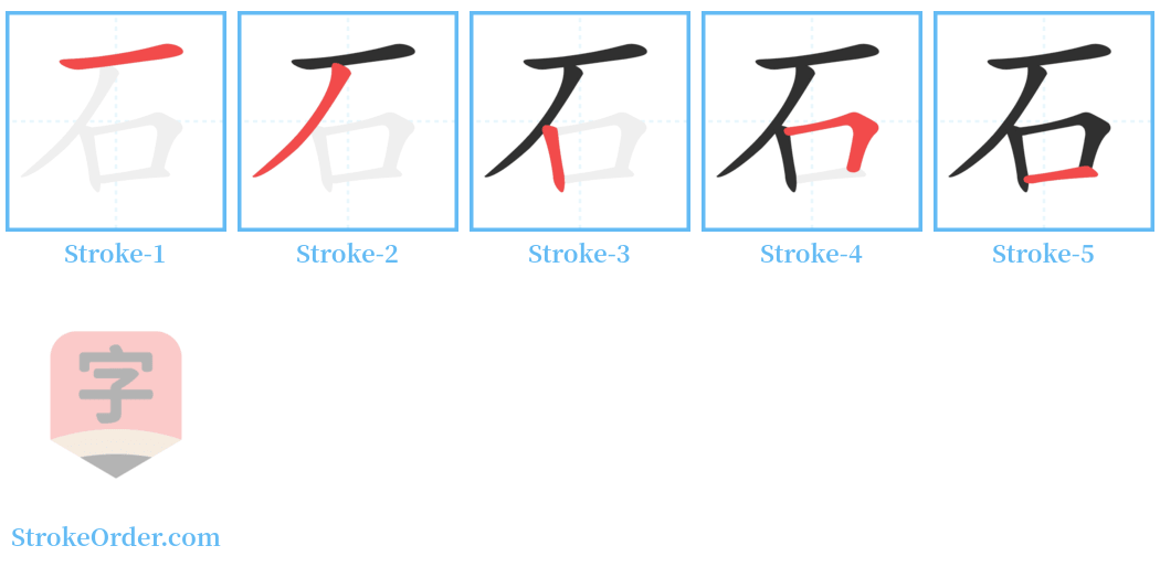 Watch the video of writing the Chinese character "石", learn the correct stroke order (笔顺) of the character "石", and master the standard way of writing the character "石".