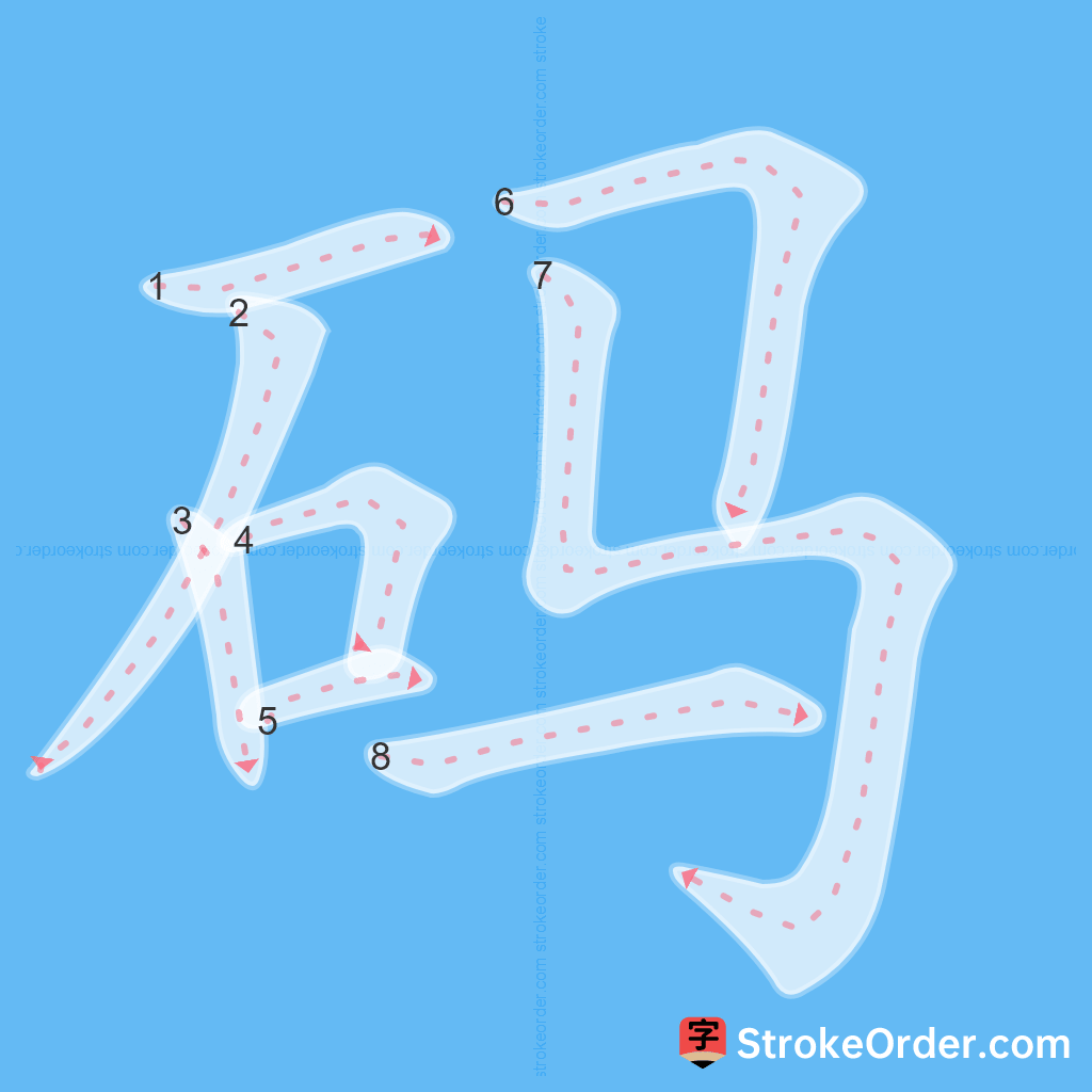 Watch the video of writing the Chinese character "码", learn the correct stroke order (笔顺) of the character "码", and master the standard way of writing the character "码".
