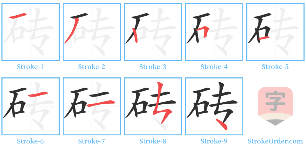 Watch the video of writing the Chinese character "砖", learn the correct stroke order (笔顺) of the character "砖", and master the standard way of writing the character "砖".