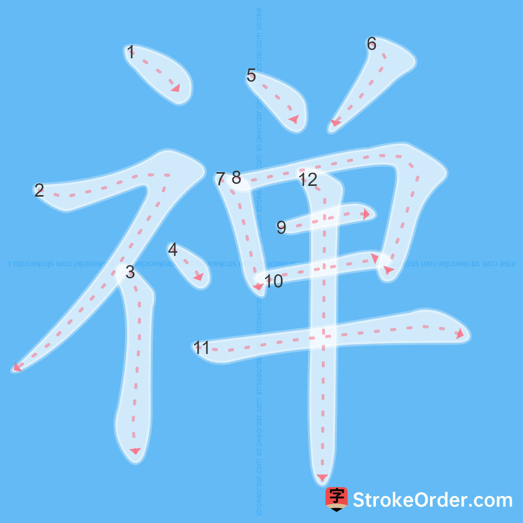 Watch the video of writing the Chinese character "禅", learn the correct stroke order (笔顺) of the character "禅", and master the standard way of writing the character "禅".
