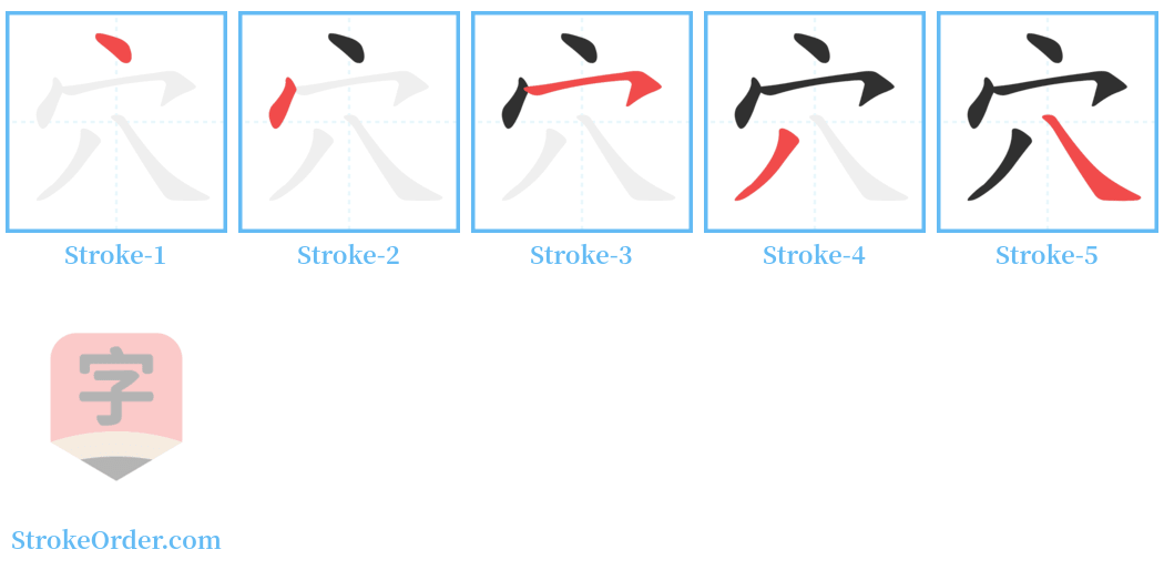 Watch the video of writing the Chinese character "穴", learn the correct stroke order (笔顺) of the character "穴", and master the standard way of writing the character "穴".