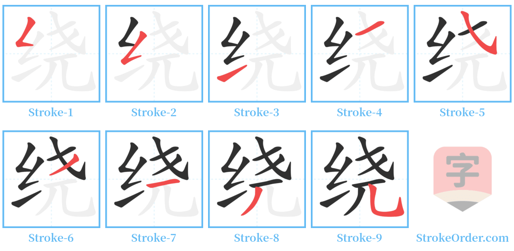 Watch the video of writing the Chinese character "绕", learn the correct stroke order (笔顺) of the character "绕", and master the standard way of writing the character "绕".