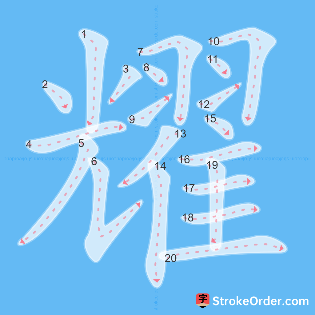 Watch the video of writing the Chinese character "耀", learn the correct stroke order (笔顺) of the character "耀", and master the standard way of writing the character "耀".
