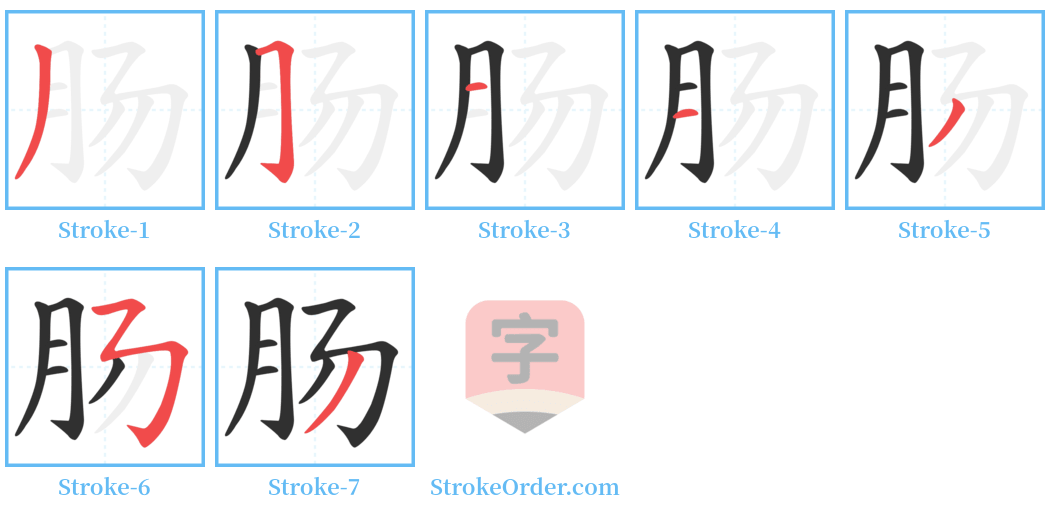 Watch the video of writing the Chinese character "肠", learn the correct stroke order (笔顺) of the character "肠", and master the standard way of writing the character "肠".