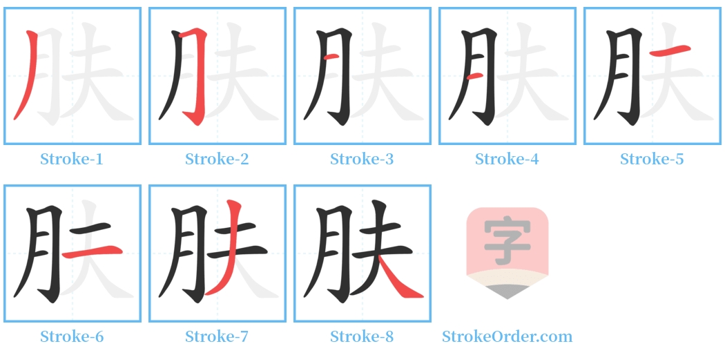 Watch the video of writing the Chinese character "肤", learn the correct stroke order (笔顺) of the character "肤", and master the standard way of writing the character "肤".