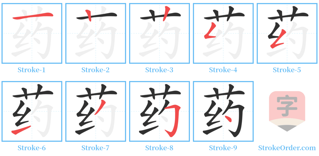 Watch the video of writing the Chinese character "药", learn the correct stroke order (笔顺) of the character "药", and master the standard way of writing the character "药".