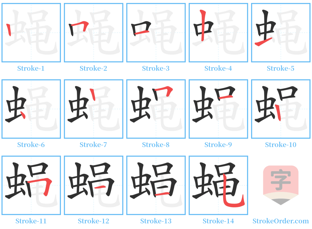 Watch the video of writing the Chinese character "蝇", learn the correct stroke order (笔顺) of the character "蝇", and master the standard way of writing the character "蝇".