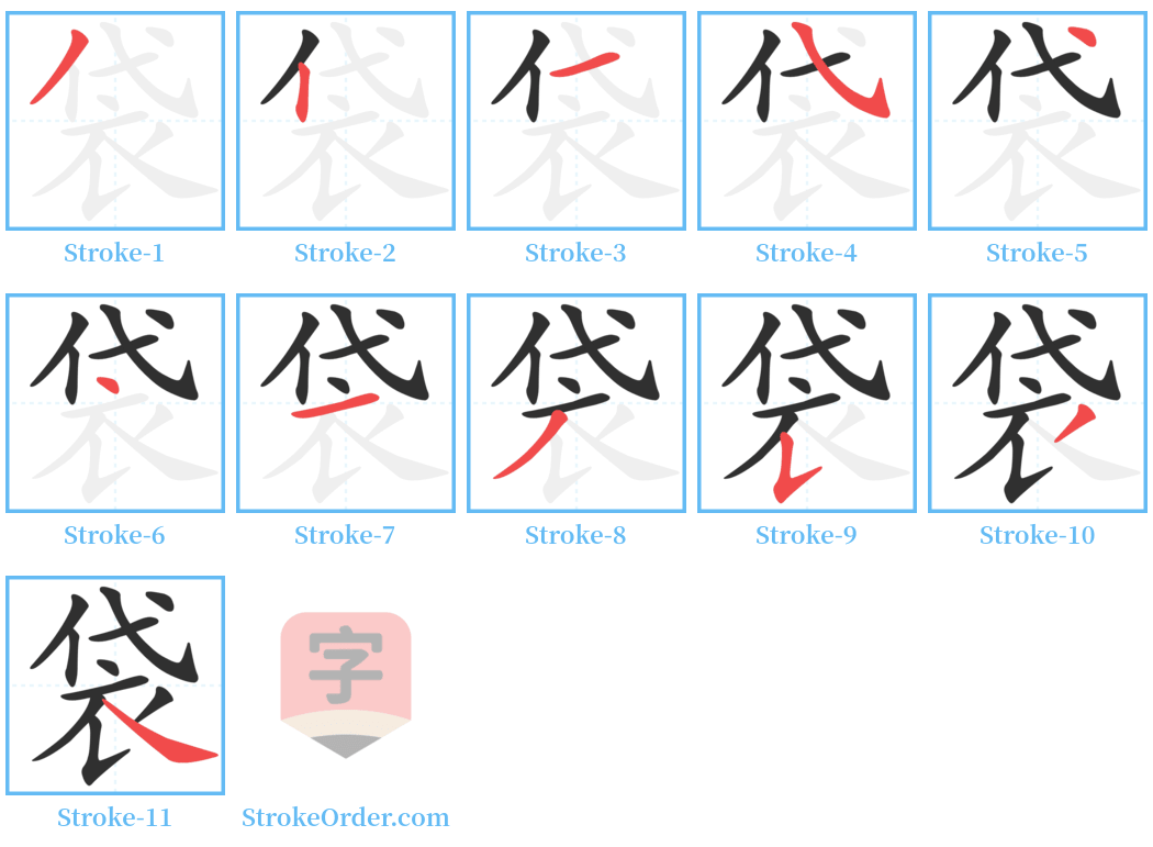Watch the video of writing the Chinese character "袋", learn the correct stroke order (笔顺) of the character "袋", and master the standard way of writing the character "袋".