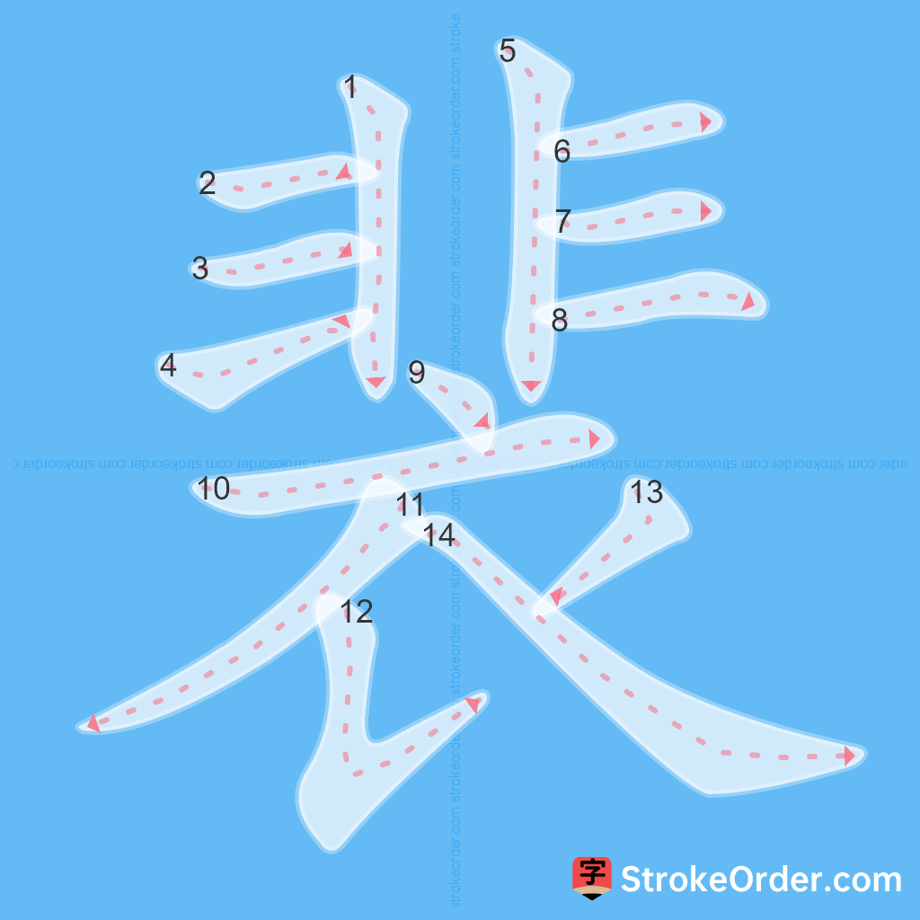 Watch the video of writing the Chinese character "裴", learn the correct stroke order (笔顺) of the character "裴", and master the standard way of writing the character "裴".